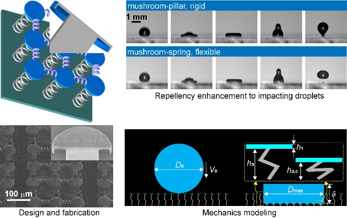 近日,买球官网彭志科教授课题组在Science Advances上发表题为“Liquid repellency enhancement through flexible microstructures”的论文,提出了蘑菇-弹簧构型柔性微纳表面结构,聚焦表面抗液防冰技术难题。买球官网博士后胡松涛和瑞士苏黎世联邦理工学院博士后曹小宝为共同第一作者,彭志科教授和史熙教授为共同通讯作者,英国帝国理工学院Daniele Dini教授团队和瑞士苏黎世联邦理工学院Andrew deMello教授团队、王京教授团队为论文合作单位。