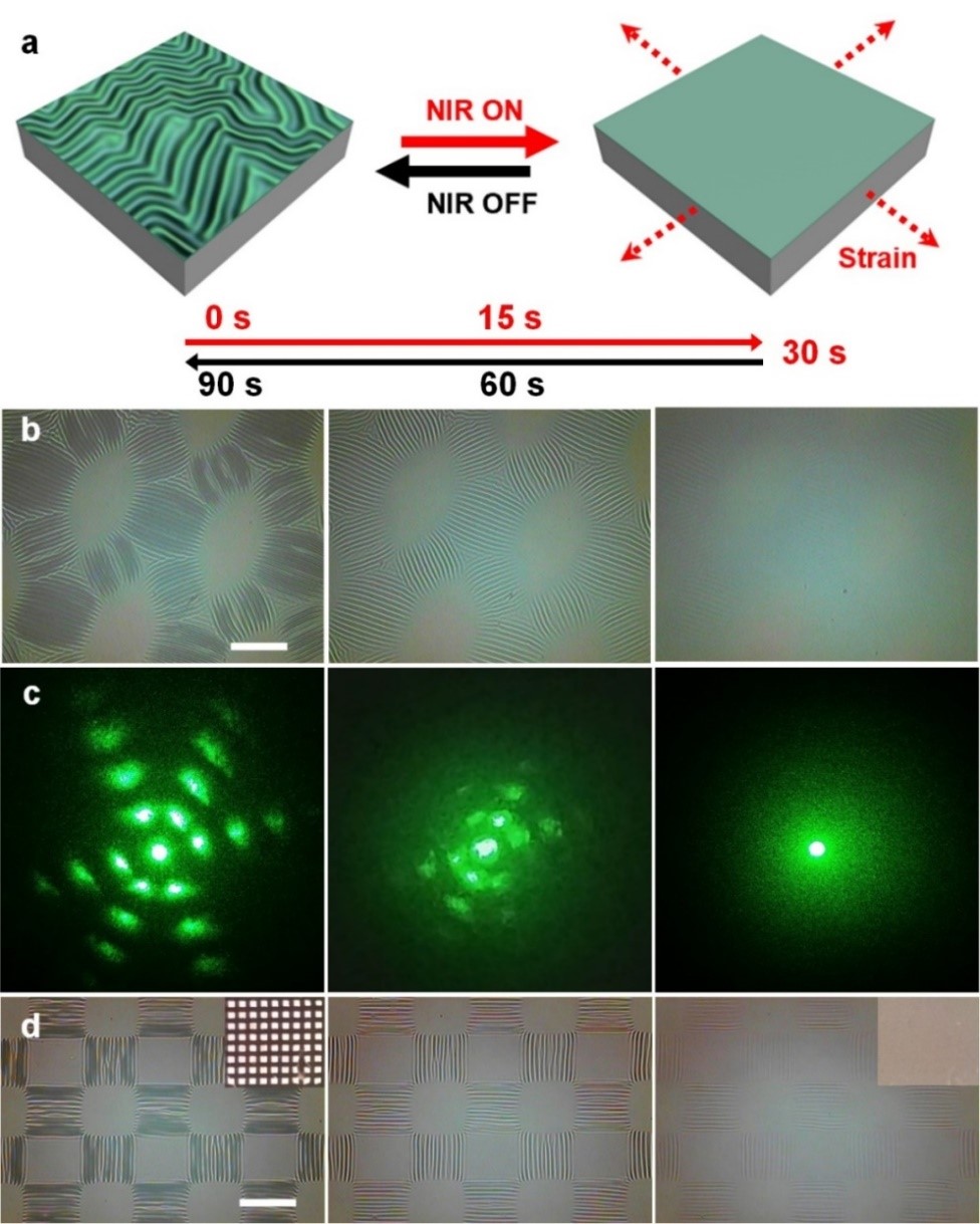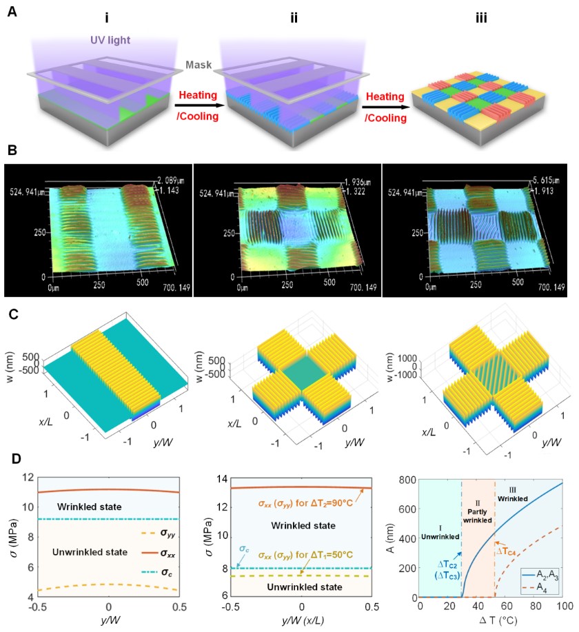 (a) 程序化光控表面褶皱结构的策略;(b) 多重曝光下褶皱形貌演化规律;(c-d) 二维有序褶皱形貌与表面薄膜应力之间的关联关系