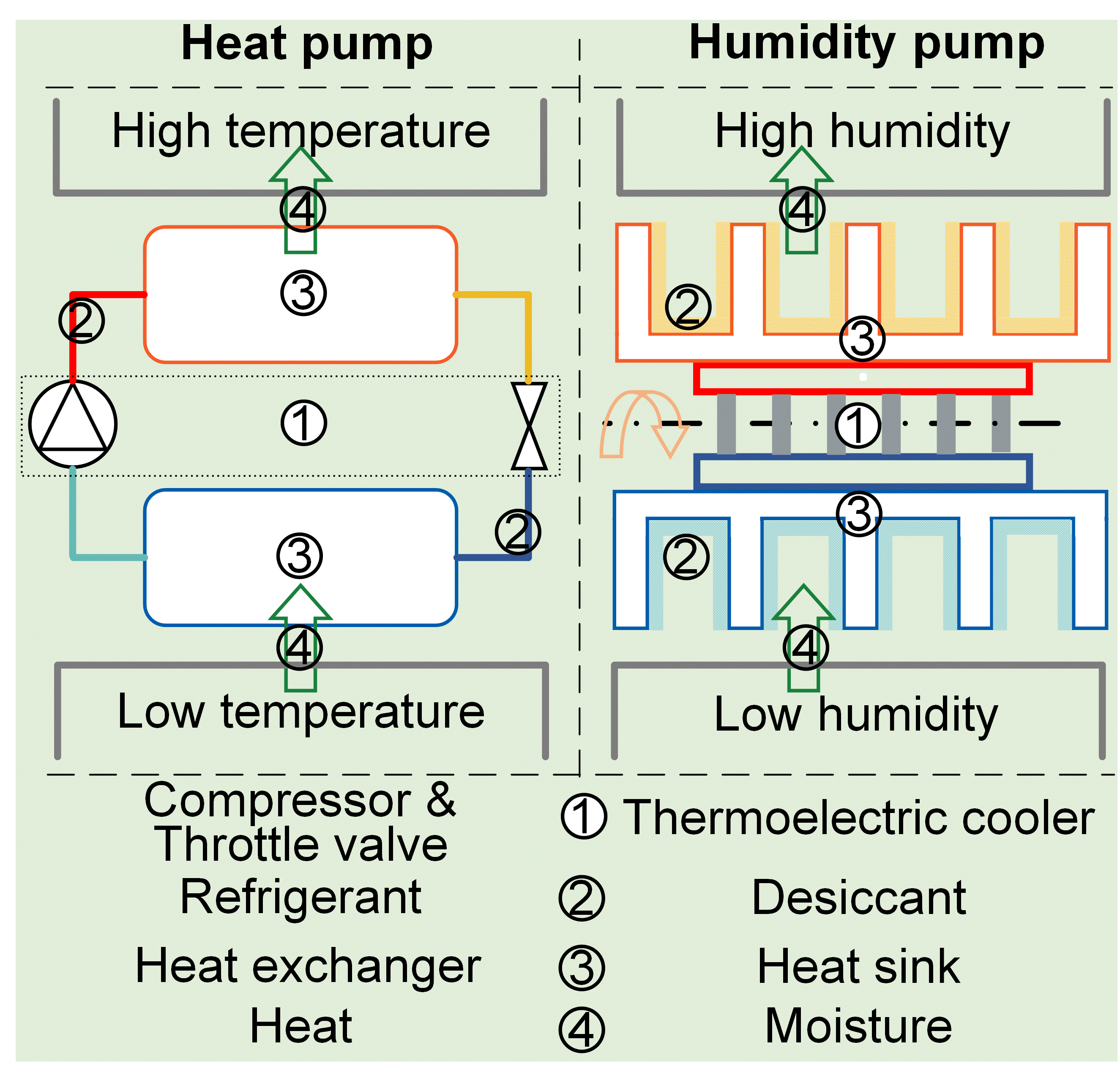 传统除湿技术在面对微环境控制需求时,既无法避免过冷/过热引起的空气显热损失,又难以小型化。同时,现有小型除湿技术仍面临能效低、适应性差等问题。类比于热泵可以将热量从低温环境搬运至高温环境的功能,文中提出的“湿泵”可以将空气中的水分从低湿度空间搬运至高湿度空间,从而实现对湿度的主动控制。该文构建了系统级的动态计算模型,同时使用商用热电模块和硅胶除湿剂搭建了概念验证样机。通过特殊的涂层工艺和紧凑的结构设计,有效降低固态系统的接触热阻与传质阻力。典型工况下的测试结果优于其他已报道的小型除湿系统。此外,该除湿装置可以有效避免传统技术中制冷剂,冷凝水,溶液等产生的副作用,为小空间除湿需求提供了更有潜力的策略。