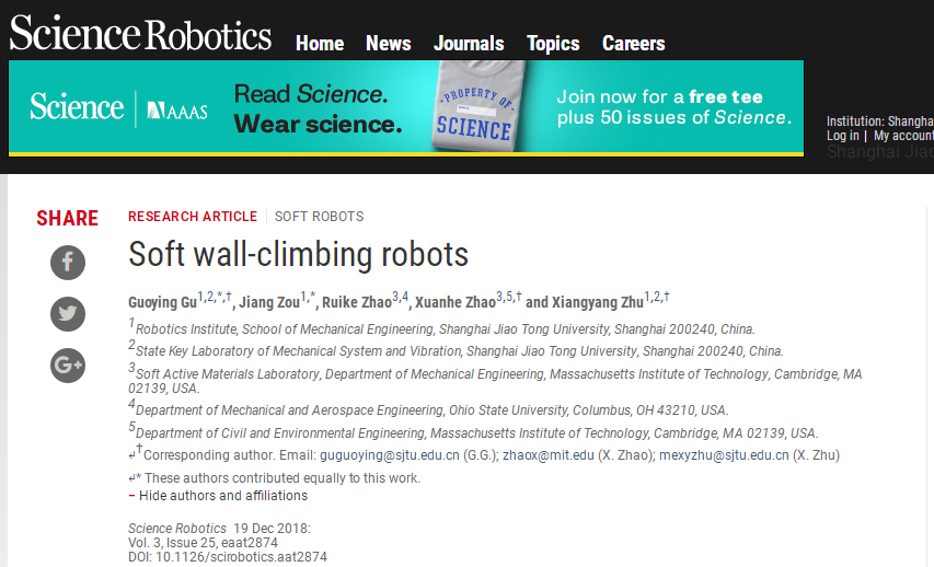 12月20日,国际著名学术期刊《科学•机器人学》(Science Robotics)在线发表了“软体爬壁机器人”(Soft wall-climbing robots)研究论文,这是我校首次在《Science Robotics》上发表论文。该论文由买球官方网站机器人研究所与麻省理工学院活性软体材料实验室合作完成,买球官方网站为第一单位,谷国迎教授和博士研究生邹江为论文共同第一作者,朱向阳教授、赵选贺教授和谷国迎教授为论文的共同通讯作者。
