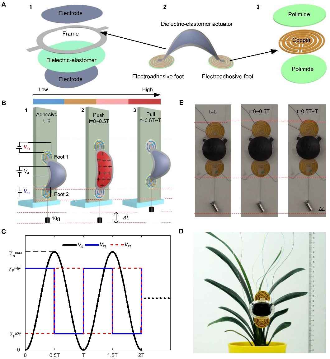 软体爬壁机器人的设计和工作原理:(A)结构设计;(B)爬壁原理;(C)协同控制策略;(D)玻璃爬壁实验示意;(E)带10g负载爬壁实验示意。