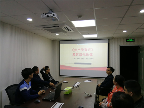 4月23日,临港师生工作党支部“纪念马克思诞辰200周年暨《共产党宣言》发表170周年”专题组织生活会在上海智能制造研究院2号楼6楼会议室举行。支部副书记杨肖带领支部成员从写作背景及发表、基本思想和主要内容,最具启发的思想方法和当代价值等五个方面共同学习《共产党宣言》。