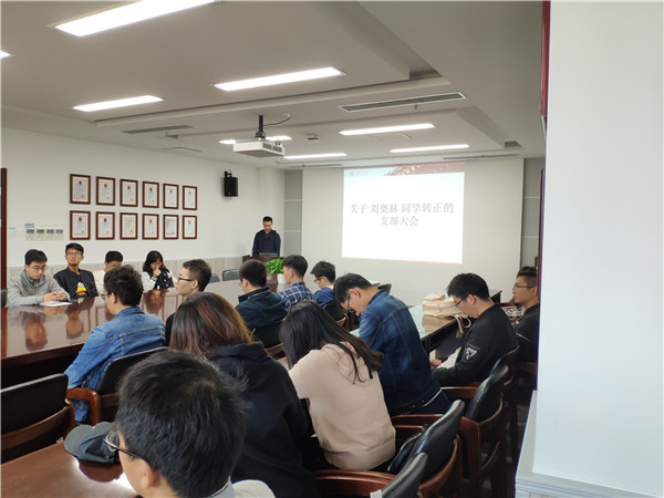 会议表决并同意了关于刘奥林同志转为正式党员的决定,入党介绍人胡涵回顾了过去一年时间里刘奥林在思想上学业上等的进步和表现,经过支部正式党员讨论后认为刘奥林同志符合一名正式党员的标准,因此批准转正。最后刘奥林发表转正后的心得,感谢同学们对他的认可,并表决心在今后严格要求自己发挥带头作用。