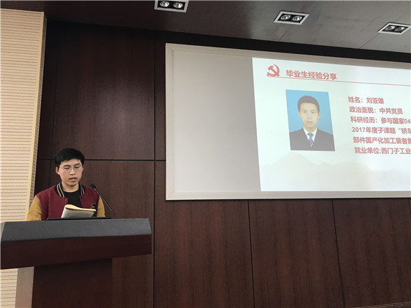 紧接着,毕业生代表覃程锦、刘亚雄和杨应彬分享了求学和求职的宝贵经验。三位毕业生代表深入浅出,从切身经历出发,讲述了自己毕业和择业过程中走过的弯路,并给予学弟学妹们很多有用的建议。覃程锦结合自己博士学习过程,强调科研首先要态度端正,其次要找到自己适合的方向,沉下心去做科研。同时勉励学弟学妹们在科研中要多吃苦、耐寂寞、多交流。