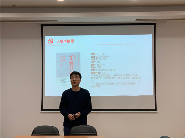 此次党组织生活会以读书生活会的形式开展。丁龙杨首先分享了阅读红色经典书籍《苦难辉煌》的感悟。该著作由中国人民解放军少将金一南完成,展现了老一辈无产阶级革命家在极其困难的环境下,建立红色政权、率领红军进行战略转移的伟大壮举,展现了中国共产党领导人民进行革命战争的正义、艰辛和伟大。丁龙杨最后引用毛主席对人民英雄的颂词鼓励同学们要高举先辈的旗帜,为中华民族的伟大复兴而努力奋斗!