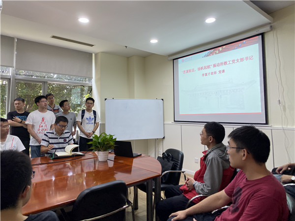 会议开始,李富才为所有党员同志上了一堂生动的党课。党课共分三个部分。第一,李富才讲述了振动所老教师们眼中的近二三十年生活的变化,人们的生活水平从低到高,以前不敢想象的一些事情现在都已变成现实,他们是祖国繁荣、富强的见证者。第二,李富才以华宏星老师从学成归国到成为潜艇专家为例,讲述了华宏星几十年如一日投身国防建设事业的事迹,华宏星是“不忘初心”的践行者。第三,李富才从自身留学日本时的一个小故事出发,告诉大家只有祖国强大,我们在国外才会被尊重,才不会受欺负。李富才希望振动所同学都能积极投身国防建设事业,为国家的崛起、民族的复兴贡献一份力量。