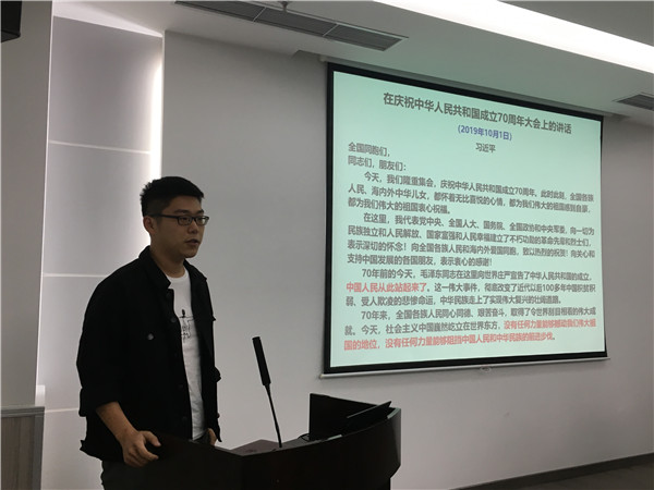 会议第一项,党嘉强同志组织大家重温了习近平总书记在庆祝中华人民共和国成立70周年大会上的讲话,透过习近平总书记的讲话看到了我国70年来的沧桑巨变,也看到了我们祖国的美好明天。随后,各小组内开展了热烈的讨论,就不同议题阐述了自己对讲话的理解。硕士第三组成员朱思萌谈到,建国70周年阅兵规模空前,新式装备的首次亮相反映出我国国防科技的飞速发展;军旗方阵和致敬方阵让我们重温了共产党人的初心和使命;战略支援部队和维和部队的首次参阅,体现出中国人民解放军面向新时代深化改革强军卫国的决心和自信。博士第五组成员王华表示,建党以来,中国共产党带领中国人民为实现从站起来,到富起来,到强起来的伟大目标不懈奋斗;作为共产党员,我们应当坚决拥护共产党的领导,守初心,担使命,找差距,抓落实,时刻关注国家大事,了解党的大政方针政策;作为学生党员,我们应该清楚的意识到目前与发达国家之间存在的差距,努力学习科学文化知识,尽己所能为国家的繁荣富强贡献自己的一份力量。