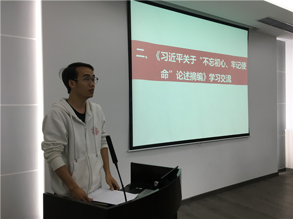 会议第二项为《习近平关于“不忘初心、牢记使命”论述摘编》学习交流,各小组分别派代表上台分享自己的感悟。硕士第一组成员王健讲到,近百年风雨兼程,我们党一路走来,从未动摇对于马克思主义的坚定信仰。新时代,我们党顺应时代发展,创立了中国特色社会主义思想,理论创新前进的同时,理论武装也要跟上。博士第二组成员林强谈到,在学习“不忘初心,牢记使命”精神的过程中,我感触最深的便是习近平总书记对于反腐倡廉的坚定信念与决心,华民族的伟大复兴不仅仅需要广大基层群众的努力,同时也需要党员干部的廉洁自律才能够切实推进伟大复兴的进程。