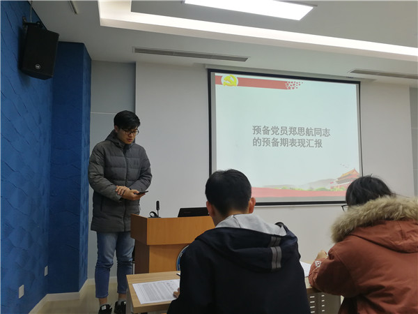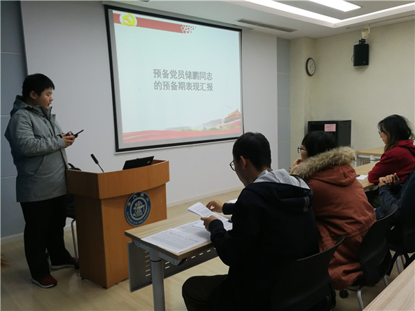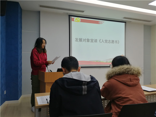 接着进行党员发展大会,组织委员张怡洁分别介绍了邹震峰和杜懿岑两位同学的入党信息、学习工作志愿等基本情况以及支部评价,随后邀请发展对象上台宣读《入党志愿书》。在入党介绍人介绍有关情况后,支委会综合考虑邹震峰和杜懿岑同学日常表现、考察人意见、群众座谈会意见和导师意见,认为两位同学在党性修养、科研工作以及日常生活中都表现良好,基本符合党员条件。与会党员也表达了自己的意见,纷纷表示赞同支委会的考察意见。经无记名投票表决和支部大会讨论,一致同意接受邹震峰、杜懿岑为预备党员。两位发展对象依次上台进行表态发言。