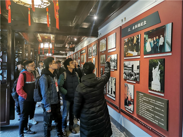 随后,大家又集体步行前往上海会馆史陈列馆及三山会址。始建于1909年的三山会馆见证了上海会馆文化的兴衰,它在助推上海近代化进程中发挥了重要的作用。同时也反映出了上海“海纳百川,兼容并蓄”的海派文化。同学们首先参观了上海会馆史陈列馆,解说员将会馆文化娓娓道来。始于同乡会和同业公所的会馆是城市发展的见证,也是上海移民城市、多元文化形成重要的组成部分。接着同学们参观了著名的三山会馆。整幢建筑别致秀丽,雕梁画栋、流金溢彩。中间的古戏台藻井为全木结构,雕刻着“五福捧寿”、“暗八仙”图案以及上海老城的八座城门、城墙。三山会馆是上海工人第三次武装起义的临时指挥部,周恩来曾来三山会馆看望起义胜利的工人同志们。上海工人武装起义前两次均已失败告终,然而以周恩来、王若飞为代表的老一代共产党人不畏困境、勇担责任的精神令 “90”后的党员同学们深受鼓舞。