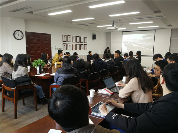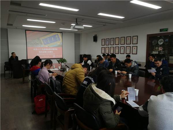 首先,纪检委员李凡用文字与视频相结合的形式带领大家回顾了一二·九运动的事件经过和历史意义。1935年12月9日,北平(北京)大中学生数千人举行了抗日救国示威游行,反对华北自治,反抗日本帝国主义,要求保全中国领土的完整,掀起全国抗日救国新高潮。这是中国共产党领导的一次大规模学生爱国运动。一二·九运动公开揭露了日本帝国主义侵略中国,并吞华北的阴谋,打击了国民党政府的妥协投降政策,大大地促进了中国人民的觉醒。它配合了红军北上抗日,推动了抗日民族统一战线的建立。它标志着中国人民抗日民主运动新高潮的来到。