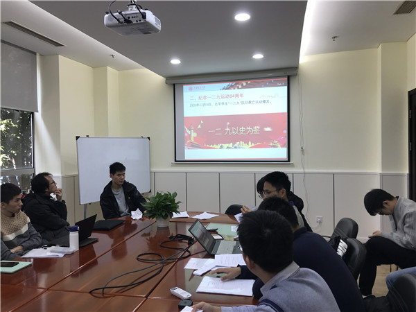 会议第二个环节是纪念一二九运动84周年。1935年12月9日,北平各大中学校的爱国学生6000余人涌上街头,向国民政府军政部长何应钦请愿,要求国民党当局停止内战,联合抗日,打倒日本帝国主义。支部书记带大家重温那一段岁月,号召大家向一二九抗日救亡运动的热血青年学生们学习,以史为鉴,发扬爱国注意精神,展现当代大学生党员的担当。