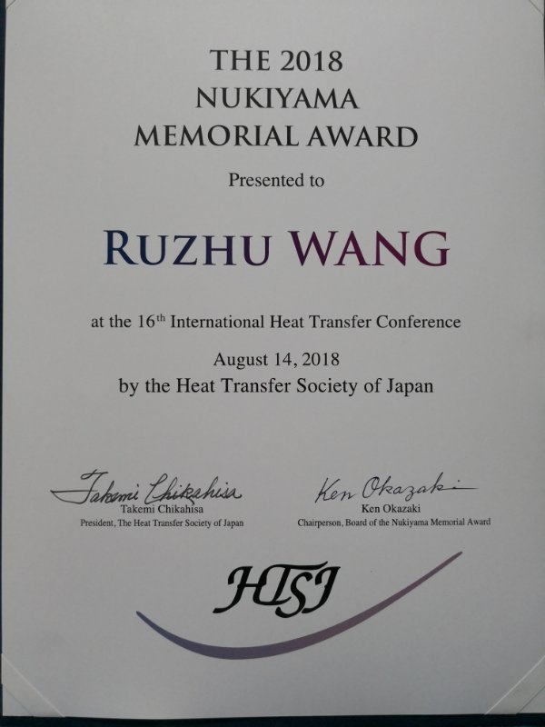 Nukiyama Memorial Award由日本传热学会发起,旨在表彰在热科学与工程领域做出杰出贡献和获得杰出成就的学者,是日本传热学会的最高奖项。Nukiyama Memorial Award是为了纪念Shiro Nukiyama教授(1896-1983)而设立,Nukiyama教授是国际传热领域的著名学者,于1934年首先发现了沸腾传热曲线(Nukiyama Curve),成为传热学教材必须讲到的经典,看到Nukiyama就会让人想起池沸腾实验。该奖项每两年全球选拔一次,此前已成功授奖三次,获奖者包括德国传热传质学会主席、达姆塔特工业大学的Peter Stephan教授(2012),美国工程院院士、麻省理工学院的Gang Chen教授(2014),以及日本流体力学学会会士、机械工程学会会士、东京工业大学的Mamoru Tanahashi教授(2016)。