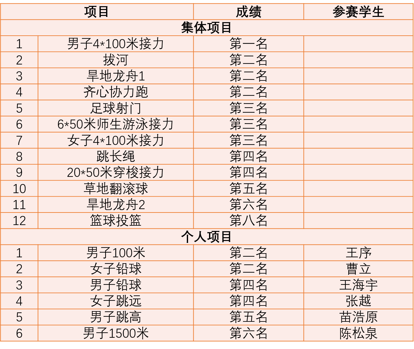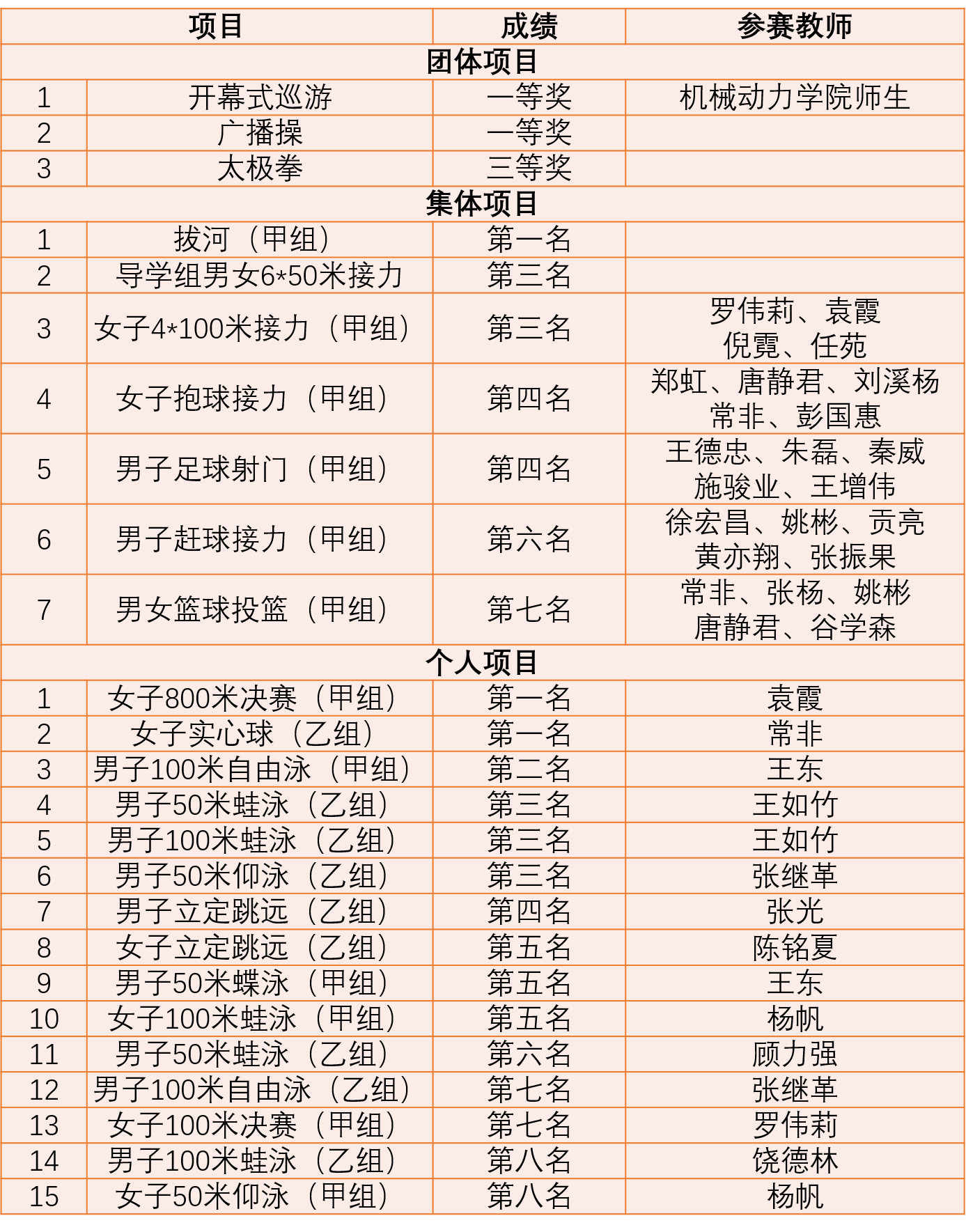 集体项目和个人项目中,学院教职工在拔河比赛、女子800米、女子实心球投远中奋力拼搏,勇夺冠军,学院学生在男子4*100米接力中获得第一名。此外,买球官网师生在立定跳远、足球射门、男子50米蝶泳、女子100米等比赛中也获得了较好成绩。
