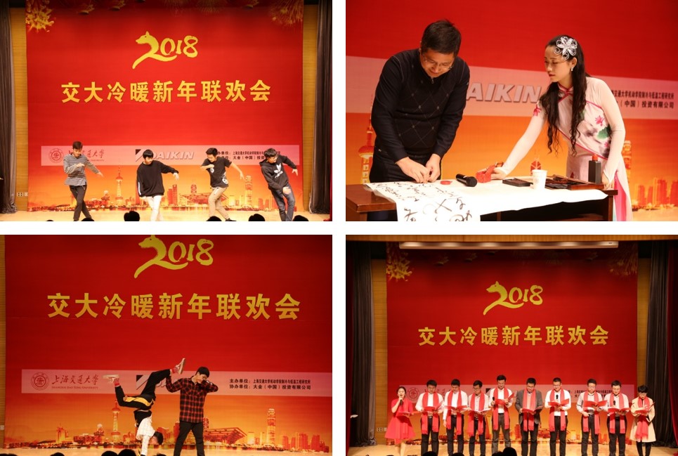 制冷所师生载歌载舞,共迎新年。525街舞协会的开场舞点燃了气氛,伴着古筝弹奏《忆故人》,陈江平教授现场题字,展现了他的多才多艺。制冷学子们也毫不逊色,演唱了《成都》,表演了情景剧《交大好声音》、相声《说点文化的事儿》、钢琴演奏及合唱《你的名字jingle bells》,尽显青春风采。大金公司的嘉宾也热情参与,带来了街舞表演《青春修炼手册》,还与学院教师进行了精彩的歌曲串烧,点燃了全场热情。