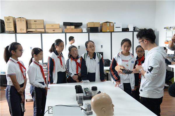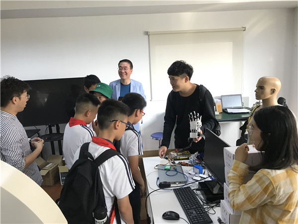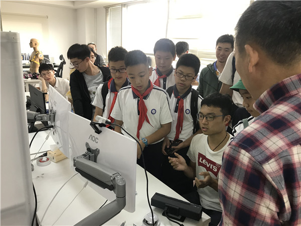 在生机电一体化实验室,开放参观的项目包含肌电信号、脑电信号的采集、解码及应用系统。志愿者王瀚介绍了肌电信号目前的一些潜在应用以及在康复医疗中的作用,展示了系所自主研发的灵巧假肢手,通过视频让孩子们对于意念控制有了很好的认识和感悟。在软体机器人学实验室,志愿者刘旭讲解了机器人在医疗领域中的应用,展示了目前世界最先进的腹腔镜机器人,它将开启未来微创手术机器人的研究方向,并在提升医疗技术方面起到重要作用。参观过程中不断有孩子们举手提问,表达他们对于科学世界的好奇与憧憬,志愿者们都一一给予细致地解答。