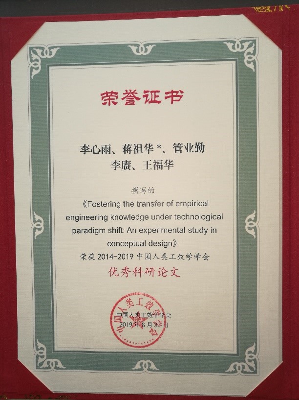 8月31日,中国人类工效学学会学术年会在西安召开,工业工程与管理系蒋祖华教授团队博士生李心雨的论文“Fostering the transfer of empirical engineering knowledge under technological paradigm shift: An experimental study in conceptual design”获2014-2019中国人类工效学学会优秀英文科研论文。