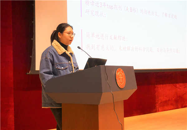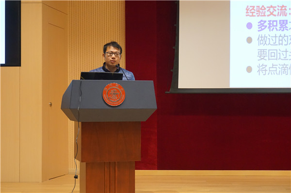 随后,会议邀请四位优秀学生与同学们分享交流自己的切身经验。博士生张先燏分享了自己在科研论文等方面的感悟,如了解自己研究领域的权威期刊,把科研当成兴趣和动力,尽早发表第一篇论文等等。博士生司国锦从成绩、项目、科研、论文等四方面分享了自己的研究生阶段的经验和思考。硕士生潘浩分享了自己设定目标、先发与人、耕者宜深等观点,使同学们在职业规划方面得到更多思考。硕士生卫宇杰生动地为大家讲述了自己在研究生阶段时间管理、个人定位等方面的经验和建议。他们的切身体验使同学们在职业规划上有了更深刻的认识和体会。