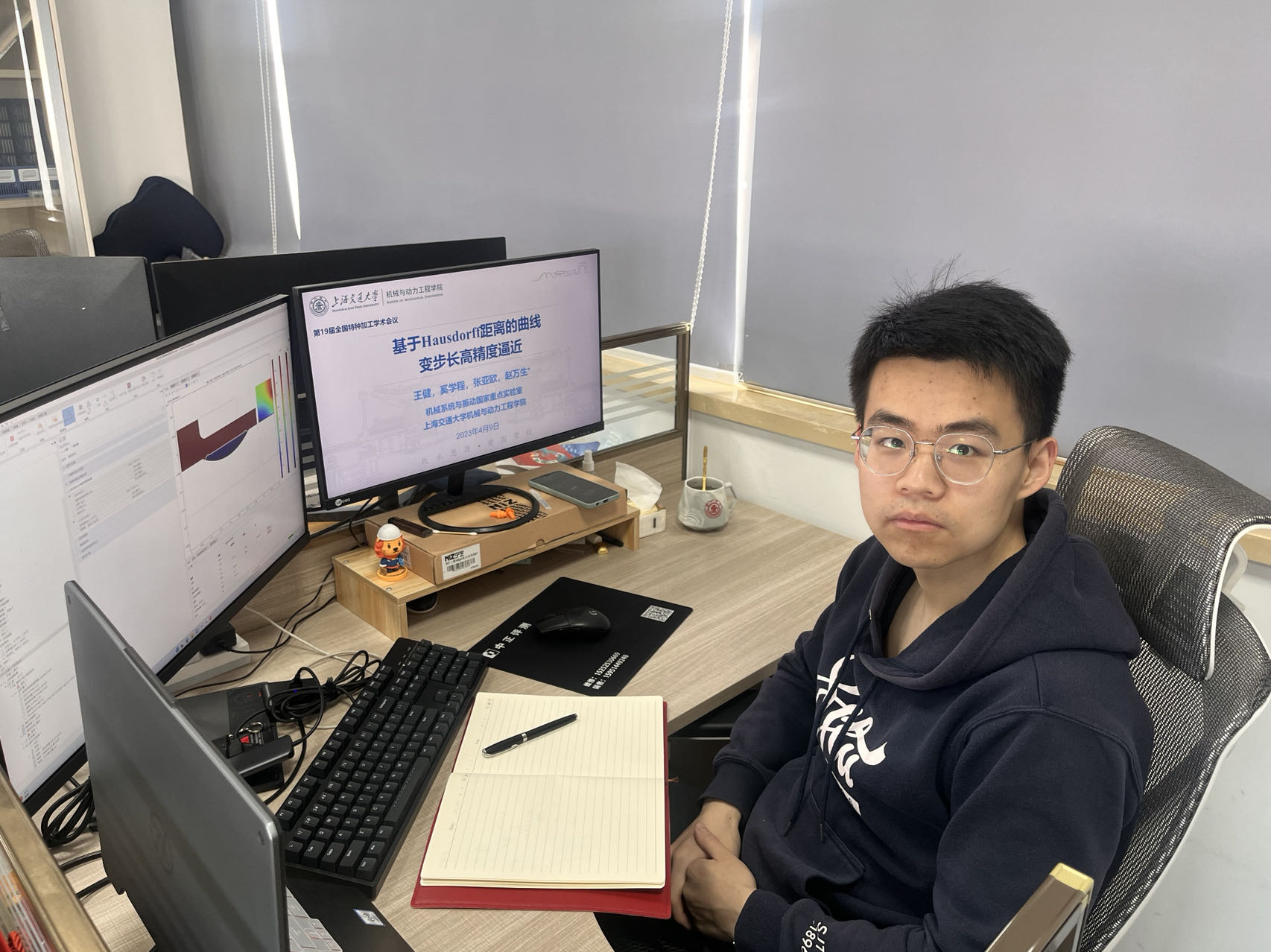 科研方面,由于本科所学专业与硕博专业方向差距较大,刚开始的科研道路充斥着迷茫和不解。看着身边同学不断发表学术论文和专利成果,他的内心十分焦急但又不知从何下手。这时赵老师在组会时的总结发言让他感觉醍醐灌顶,他说:“我们作为交大学子,应当瞄准国家重点卡脖子领域进行科研,做一些能切实解决实际问题,应用于生产一线的工作,决不能为了论文而科研,而要做到解决真问题,真解决问题”。最终,王健从之前负责的CAM软件开发项目中提炼到了五轴加工轨迹规划这一科学问题并加以深入研究,撰写了他的第一篇SCI论文。但由于缺乏相关经验,第一次返修回来得到了审稿人毫不客气的批评,一度怀疑自己甚至想要放弃。最后在导师的鼓励下,他利用出差间隙,逐条回复审稿人意见的同时,对文章进行了彻底修改,逐字逐句斟酌用词和语法,仔细推敲文章架构和逻辑,经历了一个多月的修改之后最终才得以发表。