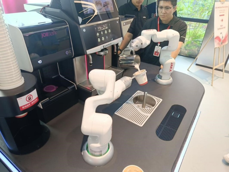 Guided by corporate representatives, the students and faculty toured JAKA Robotics' product exhibition area, gaining insights into the company's innovative design philosophy and core technologies in the field of collaborative robots. The company showcased the extensive applications of its robotic products aptly named “Cobots”, in high-end manufacturing sectors such as automotive production, manufacturing of electronic components and smart production lines, fully demonstrating China's technological strength and industrial layout in advancing new quality productive forces. To the students' delight, JAKA has also extended robotic technology to everyday life, developing products like an automated coffee brewing system and robotic noodle makers. The live demonstrations were engaging and lively, highlighting the innovative integration of artificial intelligence in lifestyle services and the smart living concepts inherent in Chinese modernization.