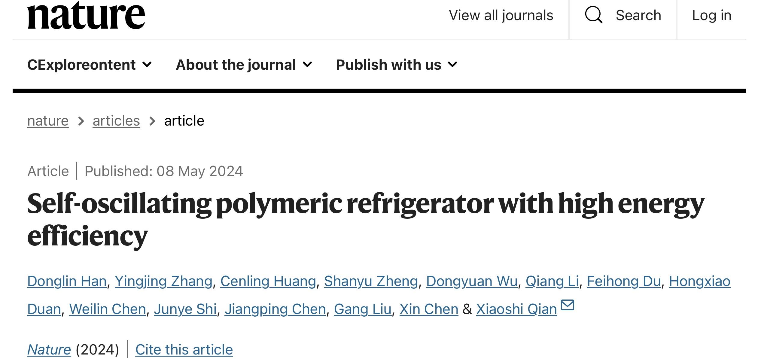 5月8日,买球官方网站买球官方网站前瞻交叉研究中心钱小石教授课题组在Nature上发表“Self-oscillating polymeric refrigerator with high energy efficiency”的论文。博士研究生韩东霖和硕士研究生张楹婧为共同第一作者,钱小石教授为论文通讯作者。钱小石教授加盟买球官方网站6年来,相关研究工作已在Nature、Science发表6篇论文,其中以第一或通讯作者发表4篇。