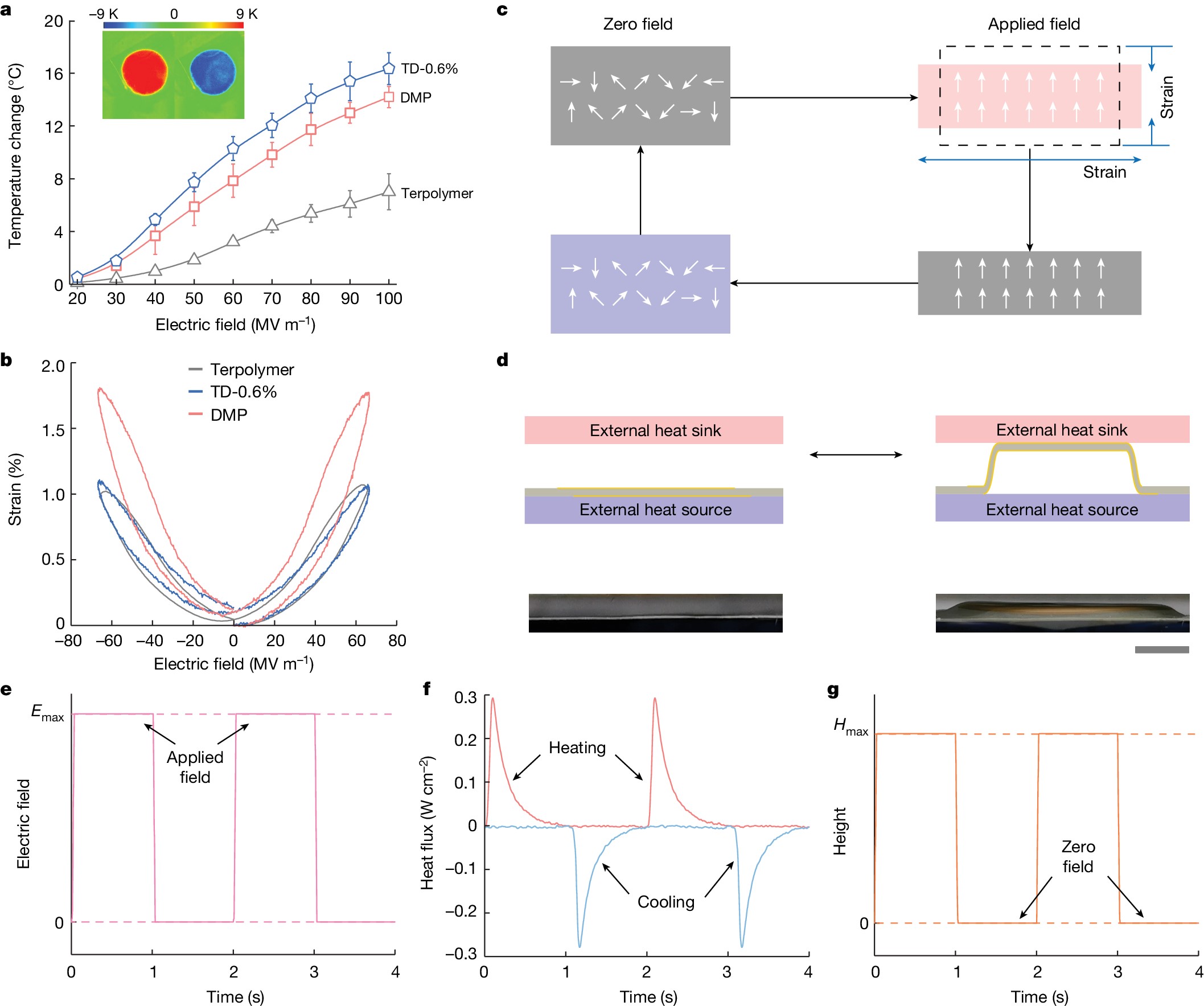 此前,钱小石教授课题组在2021年发表的Nature论文中已证实,通过高分子链内分子修饰的手段,可以大幅提升弛豫铁电高分子材料在低电场下的熵变性能。这类材料被称为双键调控高分子(Double-bond Modified Polymer,DMP)。本文中,研究人员通过进一步优化各项单体比例,使得目标高分子兼具高“电致熵变”与高“电致伸缩应变”的性能。在66.7 MV/m的电场下,DMP表现出9 K的绝热温变和1.9%的面内应变。得益于显著提升的机-电-热耦合性能,DMP薄膜无需额外的机械驱动力输入,在电场作用下同步产生足够大的空间位移和冷热变化,仅凭自身本征物理效应即组成了完整的热力学循环。