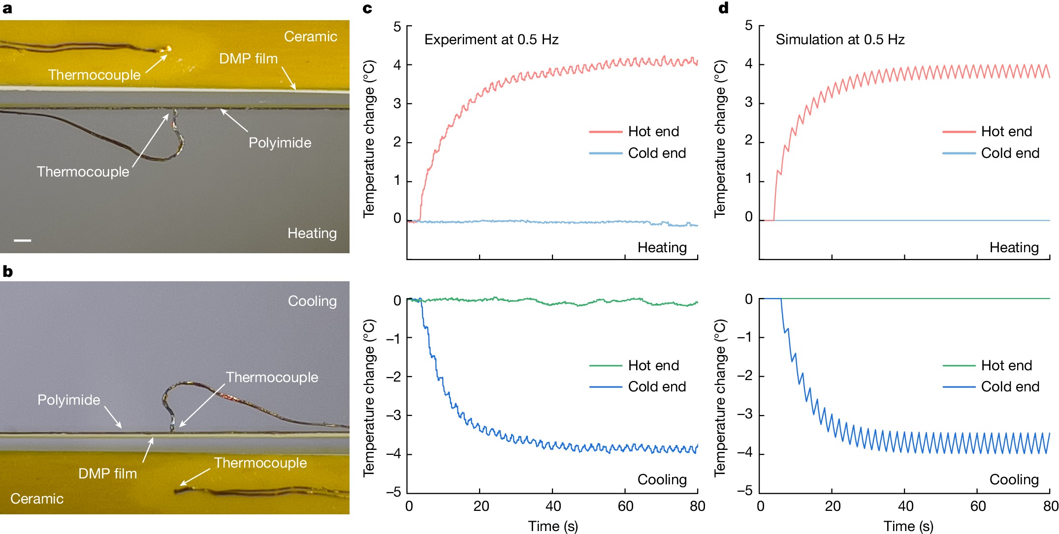 研究人员根据系统的运行逻辑针对性地搭建了系统温跨测试平台,并分别在热泵工况和制冷工况下对系统拉开温跨的能力进行了测试。在66.7 MV/m的电场和0.5 Hz的运行频率下,系统在两种工况下均能拉开近似于4 K的温跨,这表明系统的能量损耗相对较低。借助于界面热阻测量标定实验与有限元仿真计算,研究人员对系统温跨测试结果进行了深入分析。仿真计算结果表明,系统运行过程中的界面接触热阻和对流换热损耗是限制系统制冷性能的主要因素。