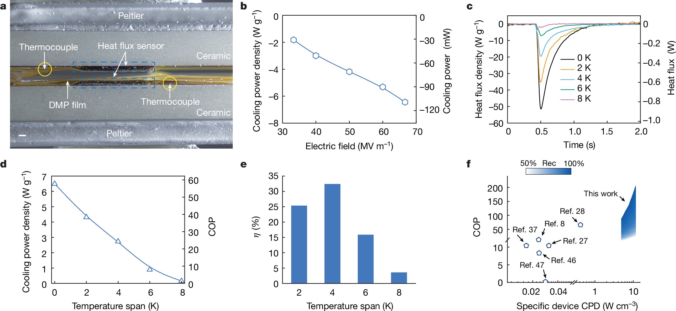 在零温跨下,该系统可以输出6.5 W/g的比制冷功率,瞬时制冷量与耗电量比值高达58(在电荷回收效率为80%的条件下)。在4 K的系统温跨下,该系统可以输出2.7 W/g的比制冷功率,对应的COP为24,实现了约32%的热力学完善度,这是迄今为止在电卡制冷系统研究中所报道的最高的热力学完善度。值得注意的是,系统的COP与所处温跨和能量回收效率息息相关,若提升电荷回收效率至99.7%以上,系统在零温跨下实现的COP将达到210左右。此外,由于无需外加驱动部件,本研究中搭建的薄膜制冷系统空间利用率高,其单位空间上的比制冷功率相比于领域内已报道的电卡制冷系统提升了近百倍。