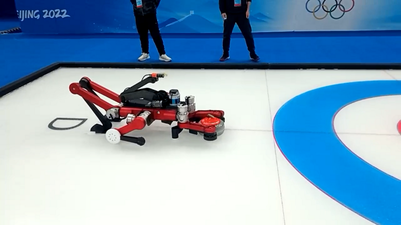 通过模仿冰壶运动员投掷冰壶的“行为特征”来设计和开发冰壶六足机器人面临多项挑战。研发的冰壶六足机器人解决了构型与驱动设计、冰壶位置测量、投壶控制等难题,建立了冰壶机器人行走和投掷两种构态转换方法,研发了基于视觉和激光的目标冰壶感知和瞄准技术,构建了机器人精准运动控制系统,实现了精准投掷和击打冰壶。该机器人具备人类投掷冰壶的行为功能,六条腿分为前、中、后三组,前部两腿为双手控制冰壶的方向和旋转速度,中部两腿和身体底部支撑滑行,后部两腿蹬起踏器。这是世界上首款模仿人蹬踏、支撑滑行、旋转冰壶行为方式的六足冰壶机器人。冰壶六足机器人在国家游泳中心(冰立方)顺利进行了击打冰壶展示。在展示过程中,六足冰壶机器人找到起踏器并识别目标冰壶位置和颜色,进而确定起始方位和滑行路线;机器人后腿蹬踩起踏器开始驱动机器人和冰壶滑行,到达预定位置和速度时,前腿再次推壶并旋转冰壶,控制冰壶投出位置、方向、速度和角速度,使冰壶靠惯性沿预计轨迹滑行,击中目标冰壶。演示中,机器人6次击打冰壶,全部击中。六足冰壶机器人具有视觉和力学感知能力,自主测量冰壶位置和蹬踏力,形成机器人行为规划和智能控制,实现了冰壶投掷运动的数字化。