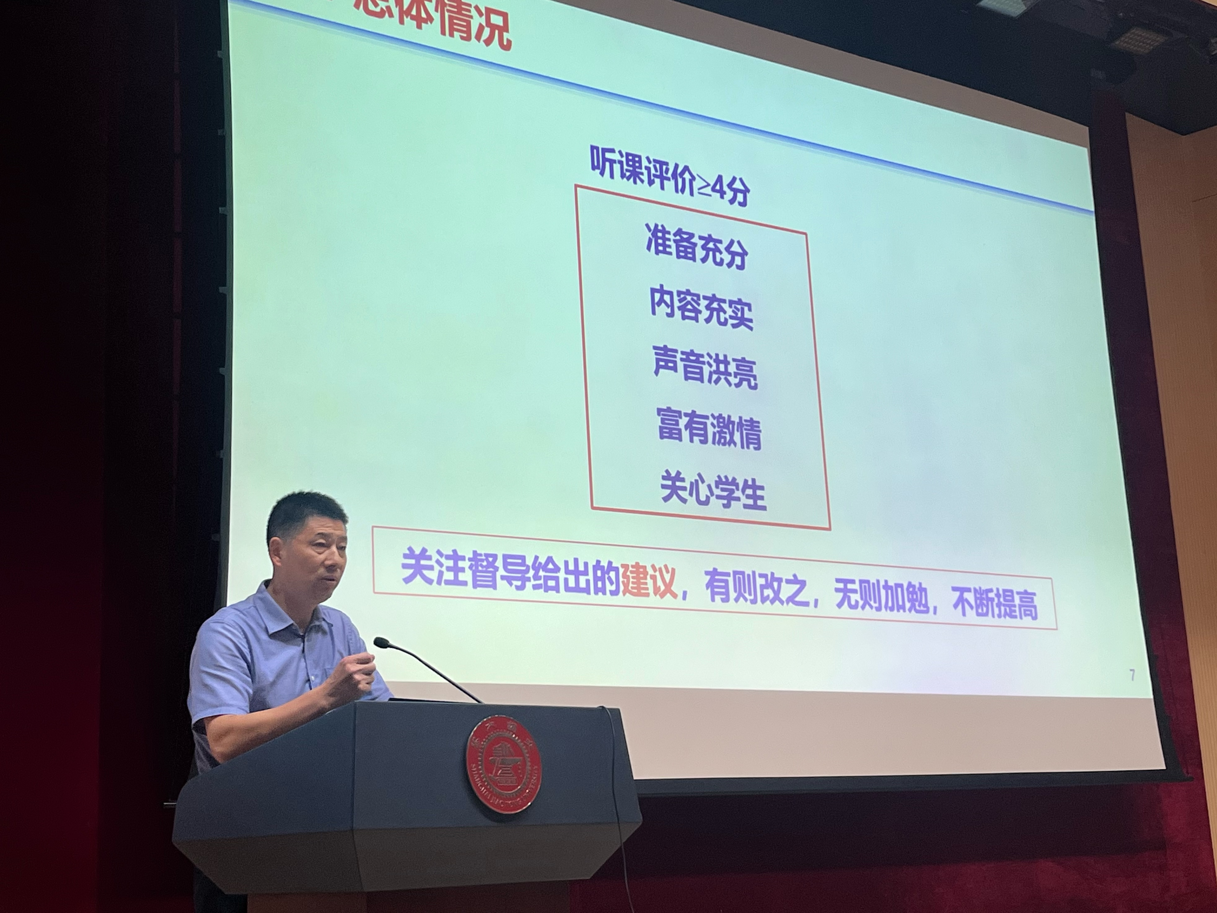 学院督导委员会主任杨培中汇报了2023年度春季学期督导工作情况,主要从听课情况、试卷抽查、毕设抽查及课程评估等方面,介绍了春季学期学院本科教学总体情况,并结合课堂教学、课程团队建设等优秀案例与存在的问题,提出相关教学建议。