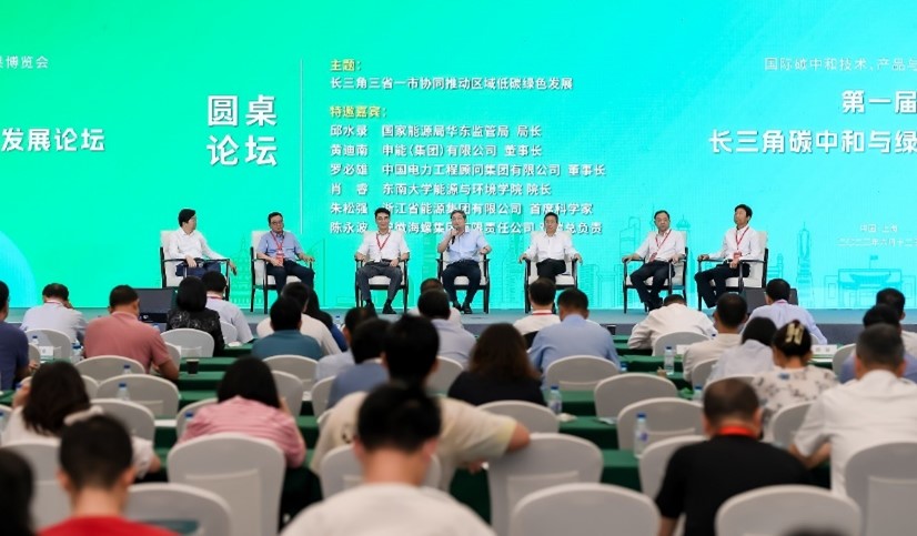 圆桌论坛由黄震院士主持。国家能源局华东监管局局长邱水录、申能(集团)有限公司董事长黄迪南、中国电力工程顾问集团有限公司董事长罗必雄、东南大学能源与环境学院院长肖睿、浙江省能源有限公司首席科学家朱松强、安徽海螺集团有限责任公司双碳总负责人陈永波围绕“长三角三省一市协同推动区域低碳绿色发展”进行了讨论与交流。