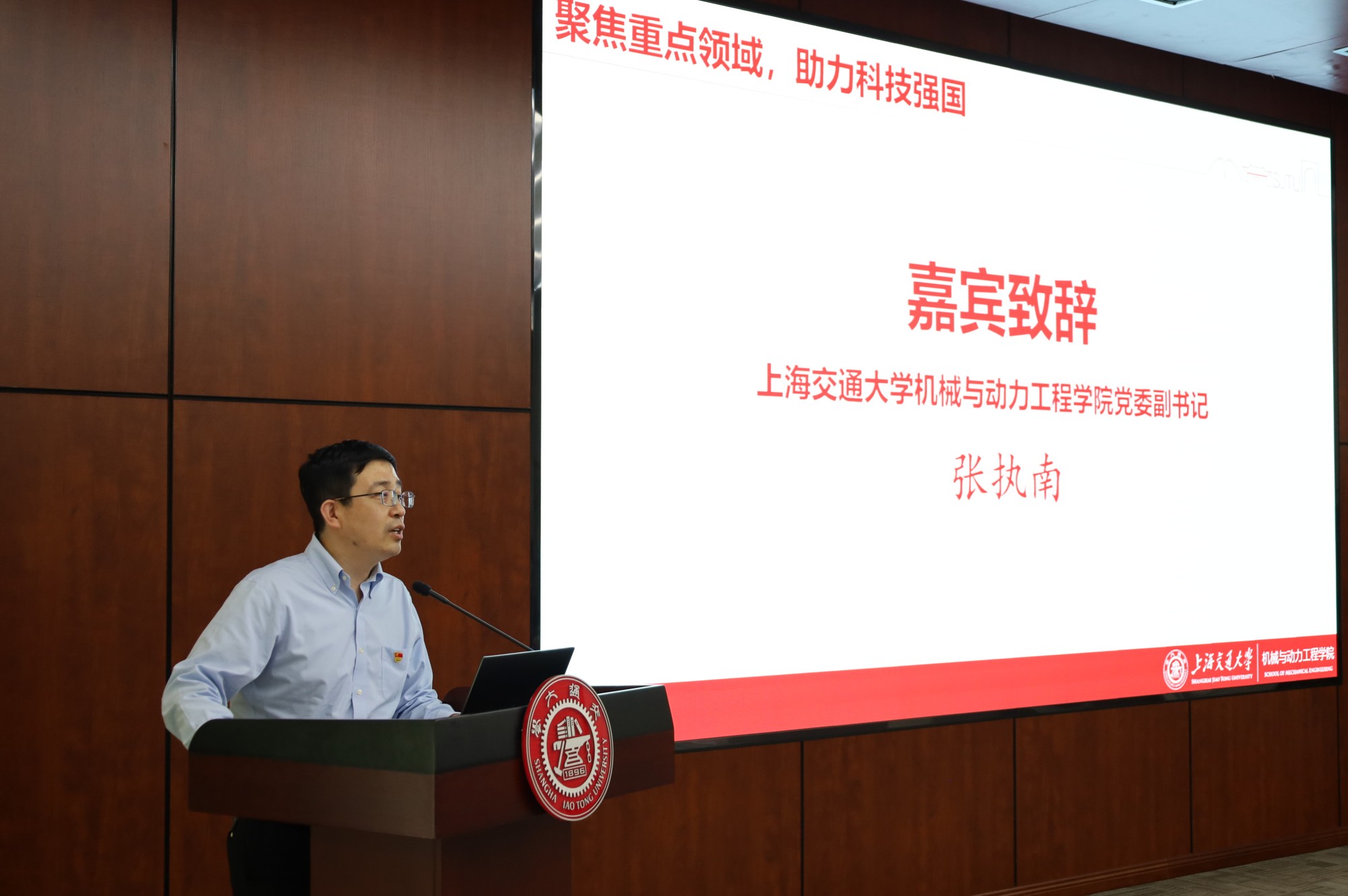 张执南致欢迎辞,希望双方保持紧密联系,开展多方面交流与合作,共同攻关科研难题,同时勉励学子们积极参加校企共建交流活动,深入了解国家重点单位尖端科技以及行业需求,将个人的发展融入到国家发展中,为科技强国建设做出贡献。