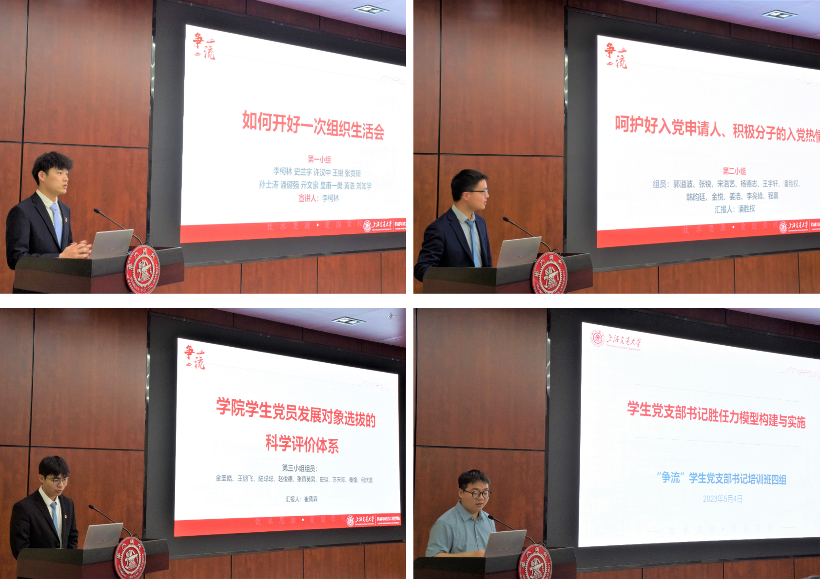 结业仪式上,培训班成员立足“如何开好一次组织生活会”“呵护好入党申请人、积极分子的入党热情”“学生党员发展对象选拔的科学评价体系”“学生党支部书记胜任力模型构建与实施”调研选题,分组开展“使命·担当”学习成果风采展示。