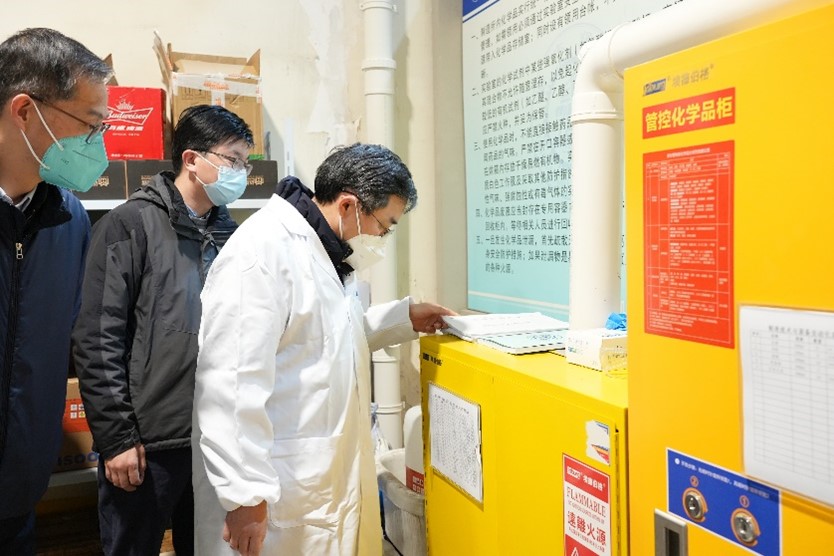 丁奎岭一行详细了解了先进制造大楼的危险源分布和危险化学品、机械安全、水电气、消防安全设施等日常安全管理情况,检查了大型设备使用管理台账、化学品管理台账、应急预案及责任落实等情况,听取了学院实验室安全工作汇报。他强调要牢固树立安全生产红线意识和底线思维,做好实验室假期封闭及开放的安全措施和应急预案,认真落实安全自查及隐患整改工作,对检查发现的安全隐患,指定整改负责人,采取有效措施,坚决消除各类安全隐患,确保假期实验室安全。