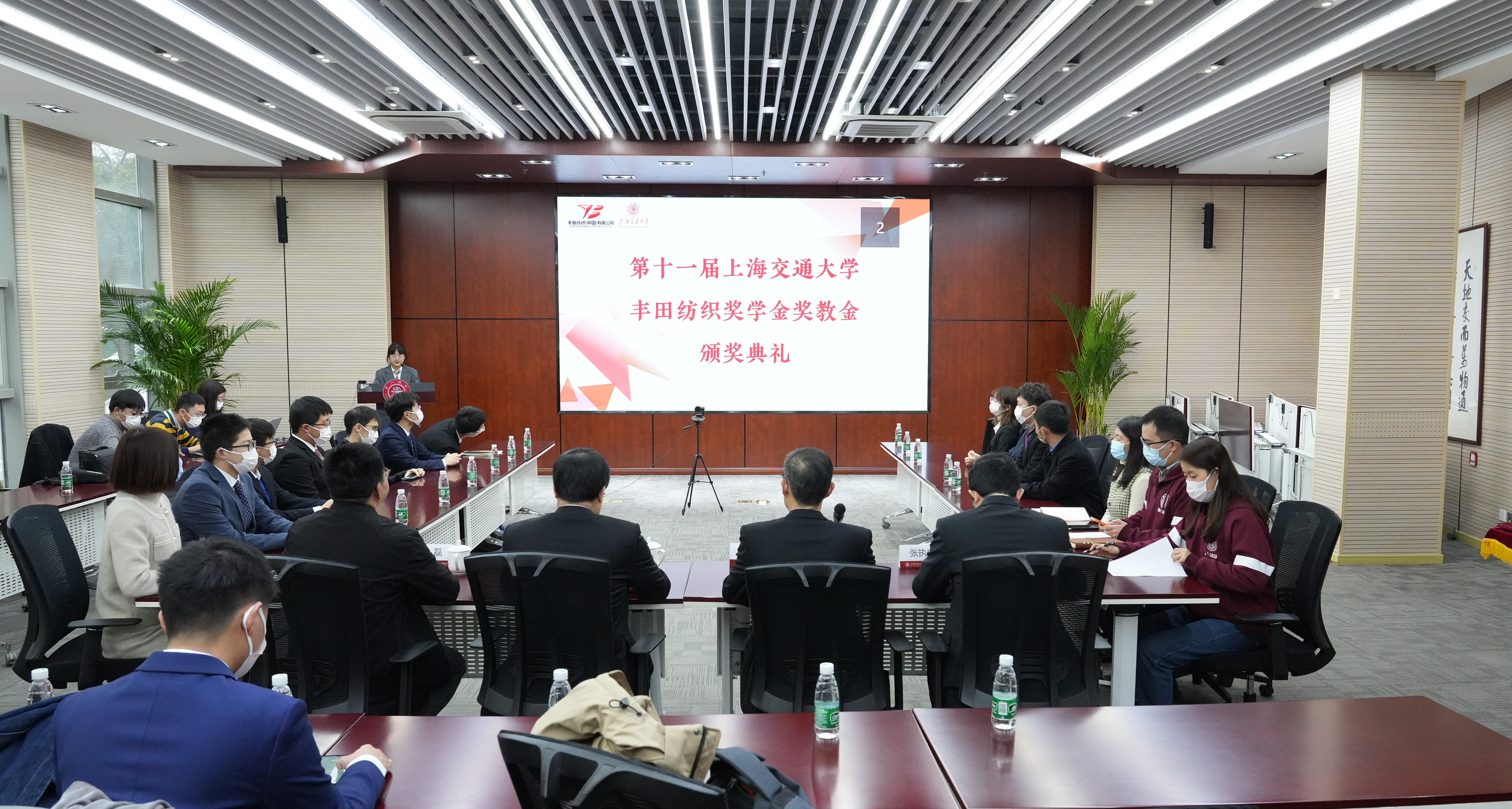 12月7日,2022年度第十一届买球官方网站丰田纺织奖学金奖教金颁奖典礼以线上线下相结合的方式举行。丰田纺织(中国)有限公司董事、常务副总经理庄志强,副总经理铃木康夫,人事总务部部长大仓吉贵,设计开发部部长王戬,人事总务部高级主管彭涛,政策法规·可持续发展战略室室长杨丽丽等企业嘉宾,买球官方网站党委常委、副校长奚立峰,买球官方网站党委书记林立涛、副院长朱磊、党委副书记张执南,以及获奖师生代表等参加了典礼。