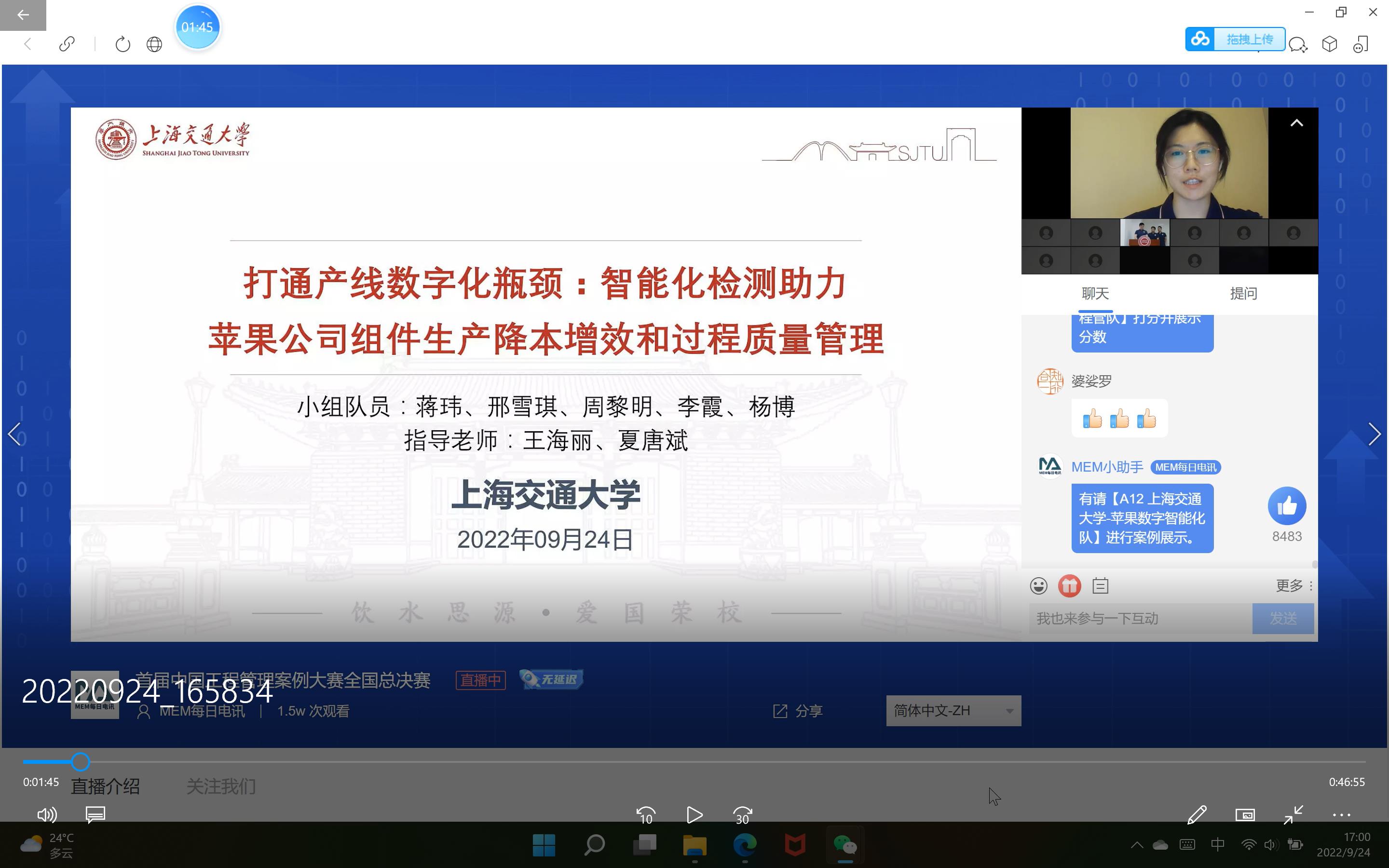 9月24日,首届中国工程管理案例大赛(2021)全国总决赛线上举行,买球官网MEM学子蒋玮等完成的案例“打通产线数字化瓶颈:智能化检测助力苹果公司产品组件生产降本增效和过程质量管理”获特等奖,王海丽、夏唐斌获最佳指导教师奖。