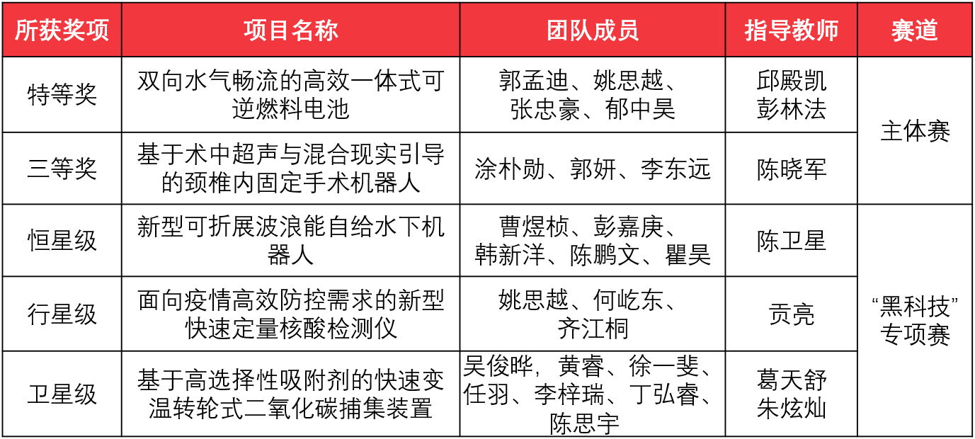 由学院邱殿凯副教授、彭林法研究员指导,学生郭孟迪、姚思越、张忠豪、郁中昊参赛的项目获第十七届“挑战杯”全国大学生课外学术科技作品竞赛特等奖,这是学院学子连续四届、第五次斩获“挑战杯”特等奖。此次大赛,学院共获特等奖1项,三等奖1项,“黑科技”专项赛恒星级、行星级、卫星级各1项。获奖名单如下: