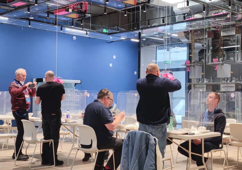 就餐人员在冬奥会主媒体中心的智慧餐厅观看机器人烹饪。新华社发