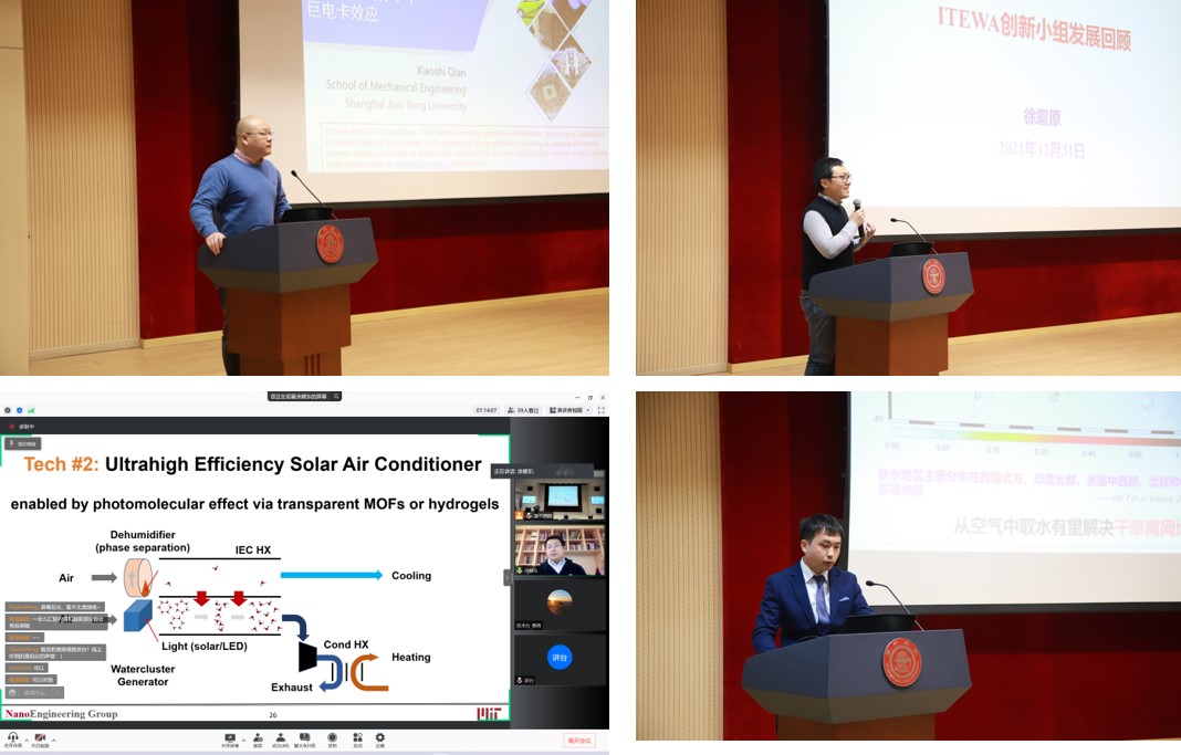 钱小石副教授、徐震原副教授、涂耀东博士、许嘉兴博士分别围绕“小改变-大效应:微量分子缺陷诱导高熵高分子中巨电卡效应”、“ITEWA创新小组发展历程”、“光分效应:水量子化的蒸发”、“高效空气取水材料设计与器件开发研究进展”进行了分享,希望大家具备探索精神,寻找创新切入点,在科研道路上“敢想敢做,锲而不舍”。