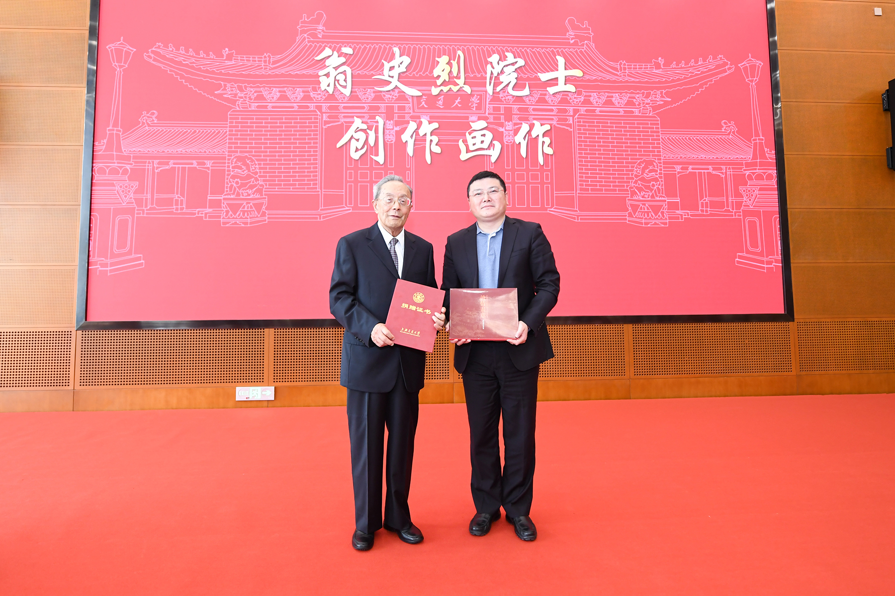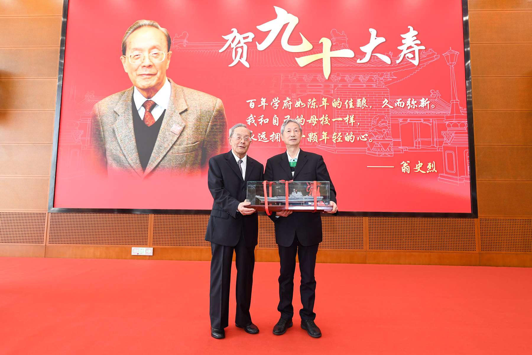 杨振斌、林忠钦代表学校,向翁史烈院士赠送其本科成绩单和闵行二部发展规划复制品作为纪念。703研究所闻雪友院士等单位和个人,作为翁史烈院士的“长期战略合作伙伴”,向翁院士赠送了航母舰船动力模型,感谢他在学界、业界做出的杰出贡献。翁院士向大家赠送自己的计算机作画画册留念,并把签名版赠送给档案文博管理中心。