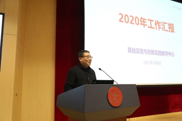 基础实验与创新实践教学中心常务副主任黄宏成作学期工作汇报,介绍了中心概况、功能与定位、中心承担/承办的课程实验、项目实训、科创竞赛以及学生创新中心-机动分中心相关工作等。