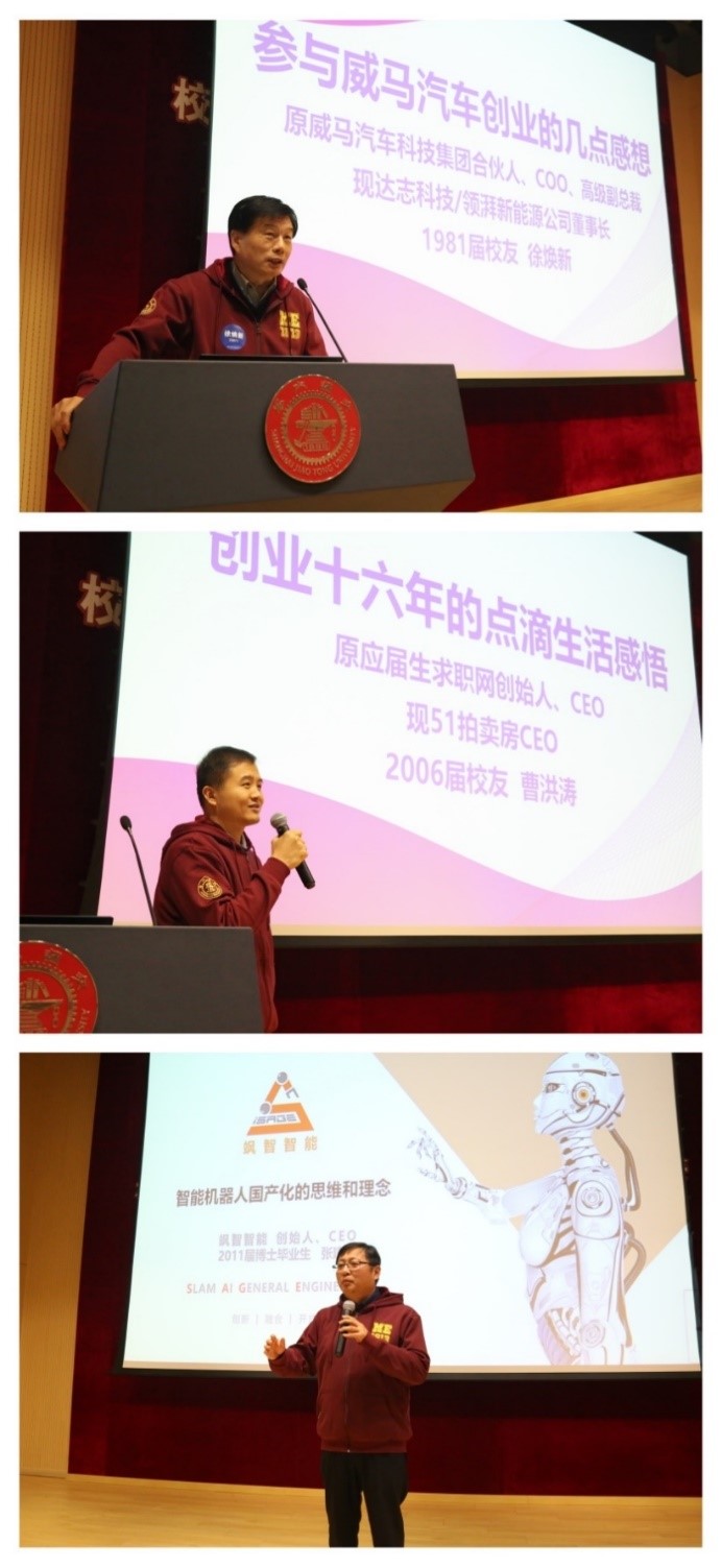 创新创业交流会上,1981届校友、达志科技/领湃新能源公司董事长徐焕新回顾了参与威马汽车创业的经历并提出关于创业的感想;2006届校友、51拍卖房CEO曹洪涛用幽默风趣的言语讲述自己创业十六年生活的点滴感悟;2011届校友、上海飒智智能科技有限公司创始人张建政对于机器人产业的国产化之路进行了多维度的分析。