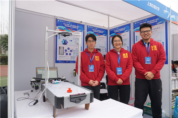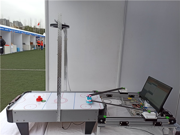 作品主要适用于居家娱乐锻炼活动,能够有效锻炼青少年和老年人的反应与协调能力。作品通过摄像头捕捉冰球和击球器并预测冰球的运动轨迹,通过串口向单片机发送信号,驱动步进电机带动同步带滑块运动,通过碳杆连接击球器使其移动到目标地点击打冰球,实现人机对战。项目成员从传统皮影戏用竹签操作影人的动作中获得灵感,所采用的二自由度并联结构没有累计误差,在快速击打冰球的时候保证了运动和控制稳定性。项目引入智能制造、机器视觉和机器学习算法开发等概念,设计产品成为老少咸宜的居家锻炼智能帮手。