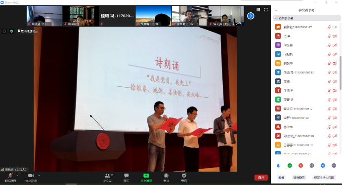 徐维泰、姚剑、姜佳彤、高永峰4名参与抗疫的志愿者诗朗诵“我是党员,我先上”,并分享了抗疫经历:路口值守测温,协助交警登记信息;参与村内交通管制志愿服务;报名社区街道防疫志愿者,负责对归国人员实行24小时的隔离监督;主动参与防疫工作,负责拦截和劝返外来车辆人员,用实际行动践行了共产党员的初心和使命。