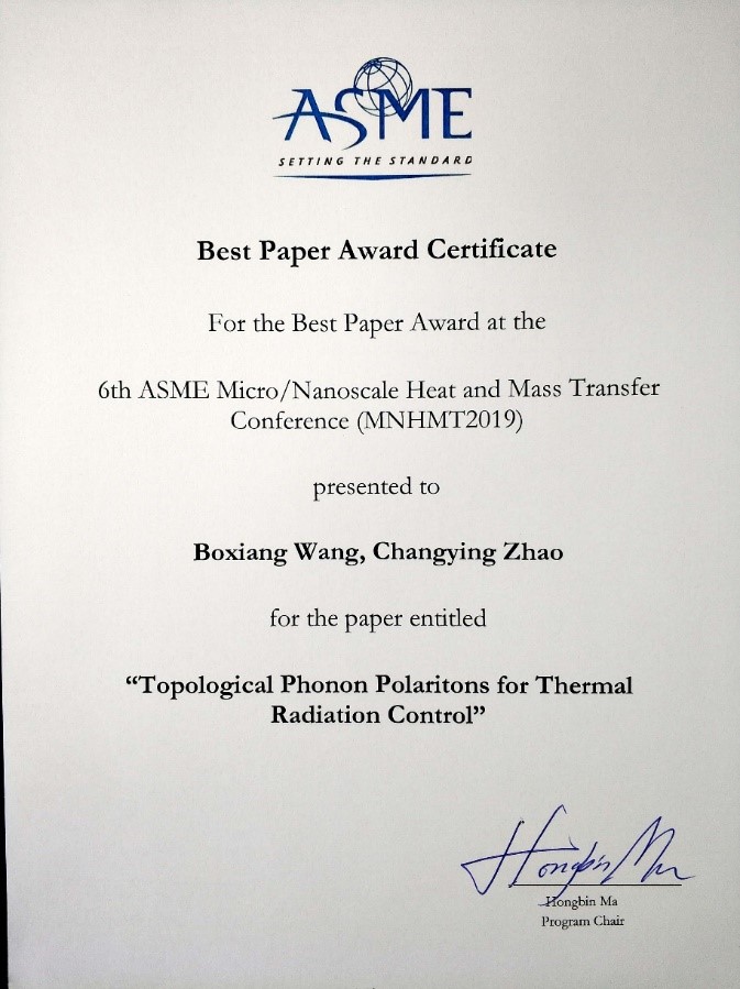 7月8日-7月10日,美国机械工程师协会第6届国际微纳尺度传热传质大会 (ASME 6th International Conference of Micro/Nanoscale Heat and Mass Transfer,MNHMT2019) 召开,买球官网博士后王博翔宣读的论文“Topological Phonon Polaritons for Thermal Radiation Control”获该会议最佳论文奖 (Best Paper Award) 一等奖(唯一)。论文的作者是王博翔与导师赵长颖教授,这也是赵长颖教授继2013年获得第4届国际微纳尺度传热传质大会最佳论文奖后再次获奖。