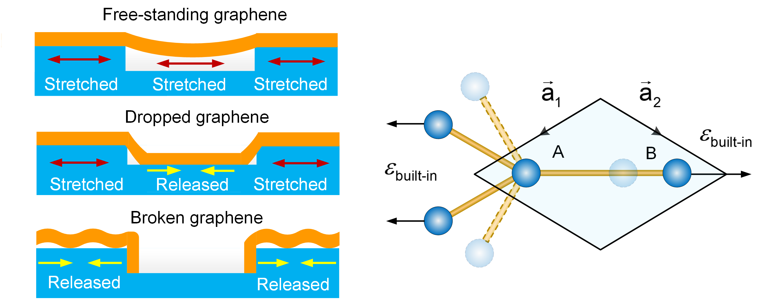 为了解释上述拉曼增强现象的诱因,胡开明等人建立了一种基于晶格振动理论的晶格动力学模型,揭示了石墨烯纳米机械谐振器的机械应力与拉曼特性耦合作用的微观机理,阐明了built-in张力对石墨烯薄膜sp2杂化键合的碳原子面内振动的抑制效应,得到了机械应力作用下石墨烯薄膜碳原子面内振动能量转移到石墨烯薄膜内C-C键势能的规律。该研究厘清了机械应力与石墨烯薄膜拉曼特性之间关联关系,为石墨烯纳米机械谐振器的力学性能表征提供了新的策略。