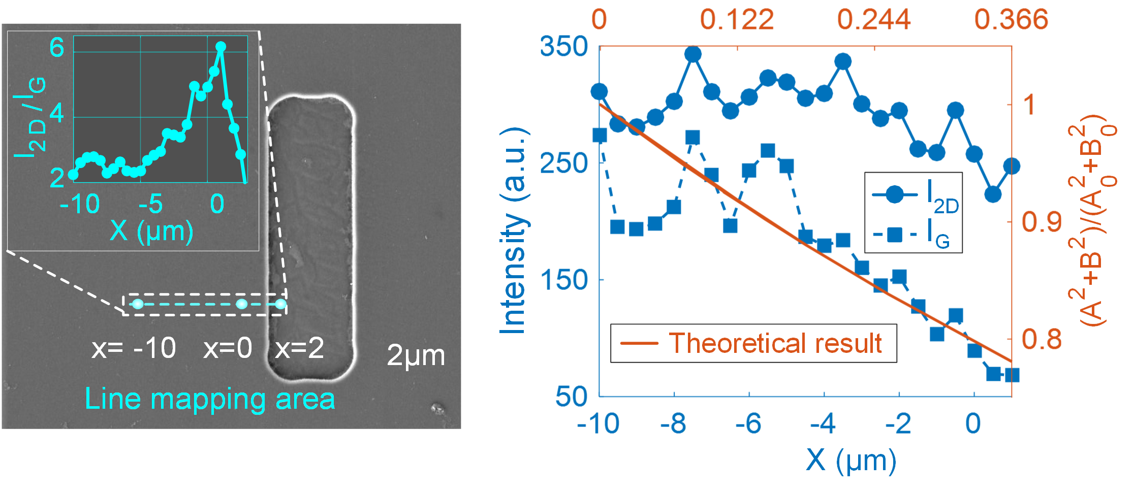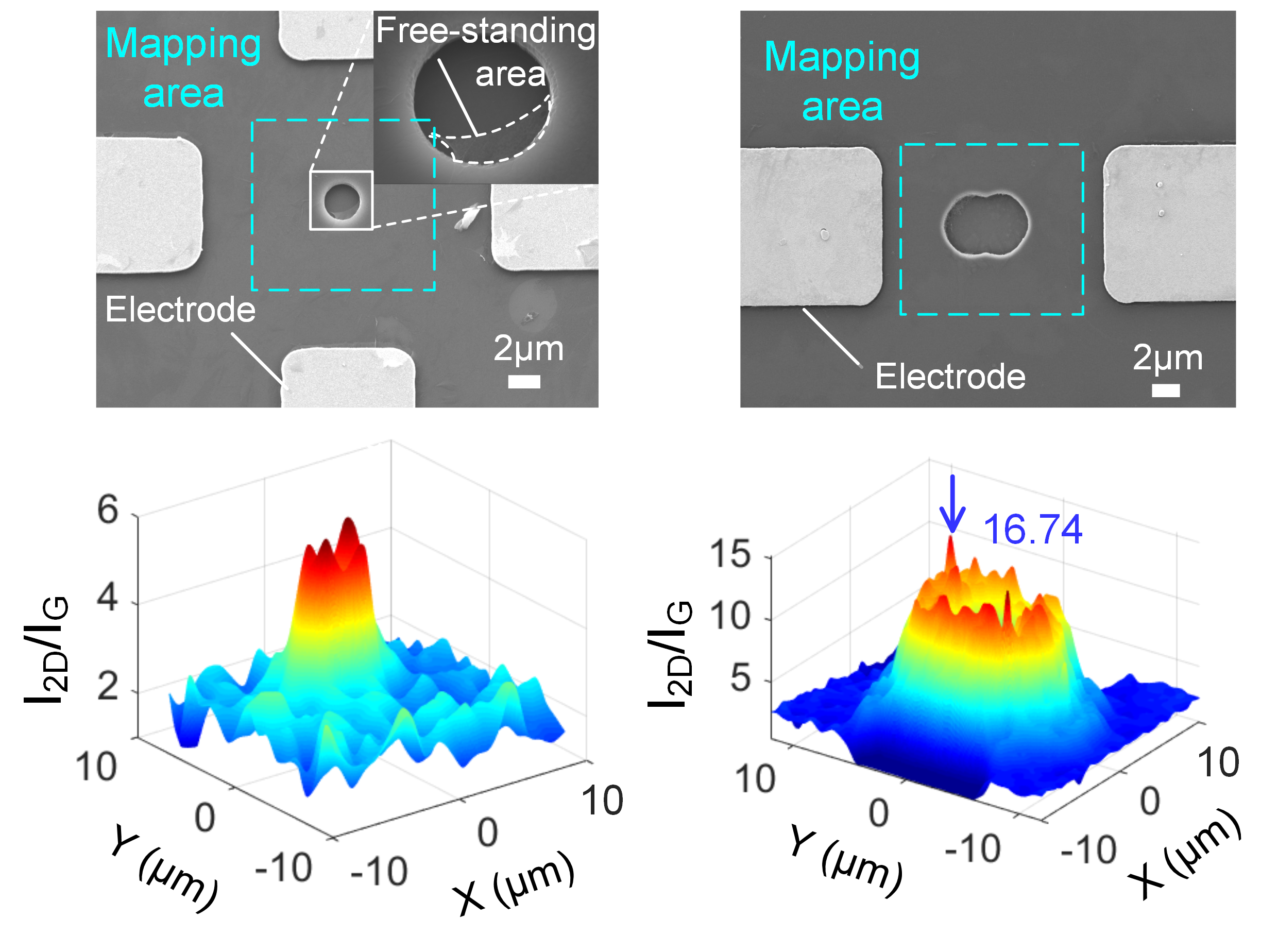 拉曼光谱作为石墨烯纳米薄膜的一种有效的无损表征方法,能够正确测量石墨烯D、G和2D主要特征峰的峰位、峰强和峰宽等拉曼特性。然而,石墨烯纳米机械谐振器的拉曼特性与其力学特性之间的关系尚不清楚,器件机械应力与拉曼特性的耦合机制有待深入研究,机械应力对石墨烯碳环的面内与面外振动特性的影响规律缺乏全面认识。张文明教授团队和狄增峰研究员团队合作研究,采用拉曼光谱等技术手段表征了悬空石墨烯薄膜的拉曼特性,首次发现了微米阱附近处石墨烯机械张力诱导的拉曼增强现象,探测到了拉曼强度比I2D/IG高达16.7,增强了670%,创造了I2D/IG最新的实验记录。该现象的宏观机理为机械应力拉伸了微米阱附近的石墨烯,抑制了石墨烯薄膜的本征波纹现象。