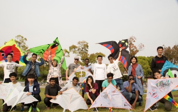 风和日丽、绿草如茵,“两人三足”的破冰游戏拉近了彼此距离。大家拿起画笔自由发挥,制作属于自己的风筝,并起了名字。随后留学生们相互配合,完成了搭骨架、捆线等准备工作。当风轻借力,一举入高空,一只只风筝乘风而起,在蓝色的幕布上划出优美轨迹。