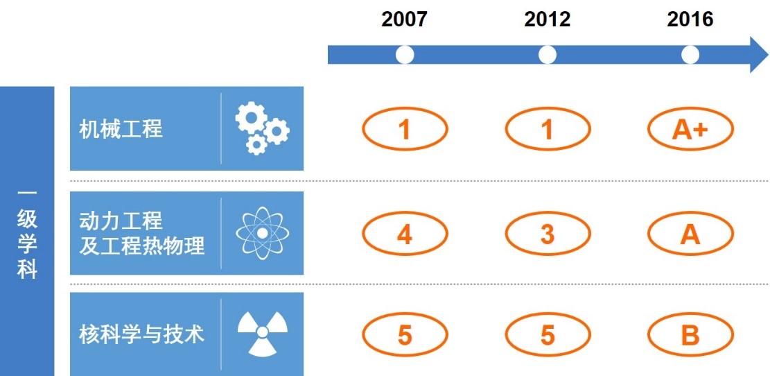 在最新一次学科评估中,机械工程学科位列A+,这是继2007年和2012年两次排名全国第一之后,机械工程学科再次领跑!同时,动力工程及工程热物理入选A档,核科学与技术位列B档。