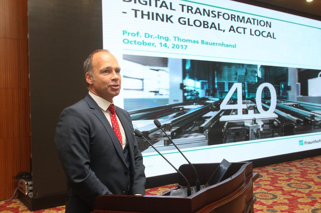 最后,Bauernhansl教授作了题为“Digital Transformation——Think Global, Act Local”(数字化转型——全球视野、行动上海)的报告,介绍了弗劳恩霍夫IPA研究所及其在德国工业4.0领域取得的成就,论述了数字化转型的发展现状和技术趋势,阐释了工业4.0的核心概念与智慧工厂的关键要素,展示了买球官方网站-弗劳恩霍夫协会智能制造项目中心的广阔未来。